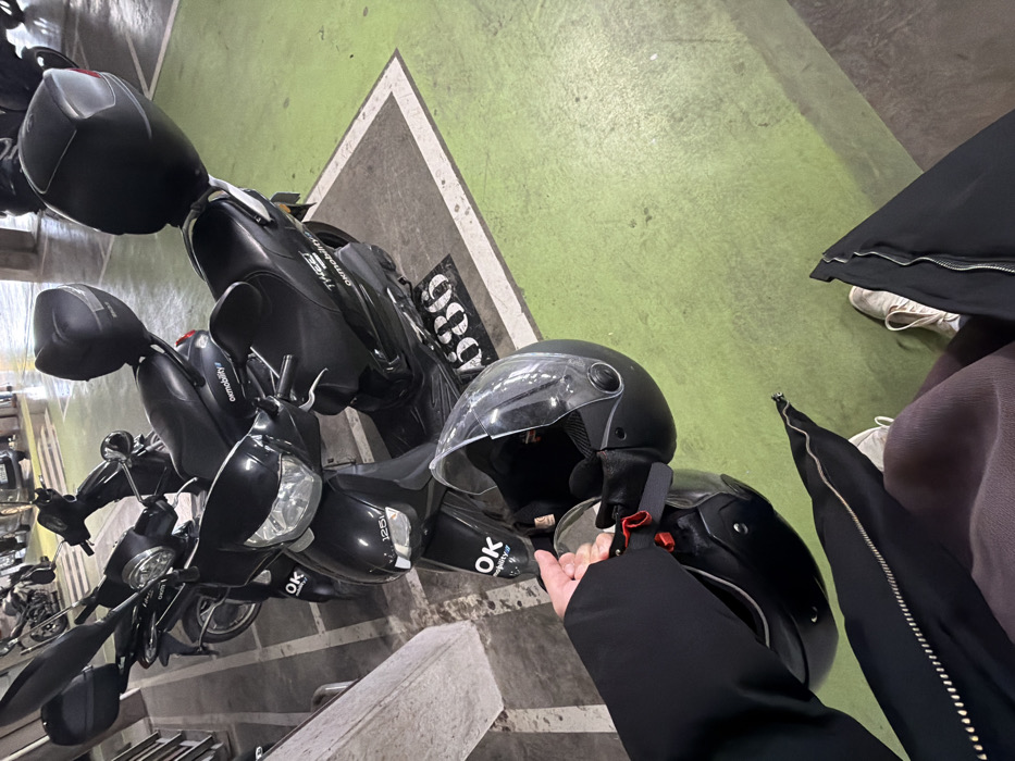 An indoor parking facility, consistent with an OK Mobility rental depot near Valencia Airport in Manises, Spain, is depicted. The floor is painted light green, marked with white lines defining parking spaces. A white rectangular parking outline containing the black number "586" is visible in the mid-ground. In the immediate foreground, a person's right hand, covered by a dark sleeve, holds a black motorcycle helmet by its red chin strap. The helmet features a clear visor. The individual's lower body is partially visible, dressed in dark clothing with a zipper detail and white sneakers. Three black scooters are prominently parked. The scooter closest to the foreground faces the viewer, displaying "125i" and "OK" branding. Immediately to its right, a black "TWEET" model scooter, branded "okmobility" and equipped with a black rear top box, is parked facing away from the viewer. A third black "okmobility" scooter is partially visible behind the foreground vehicle. Additional vehicles and concrete support columns are present in the background.