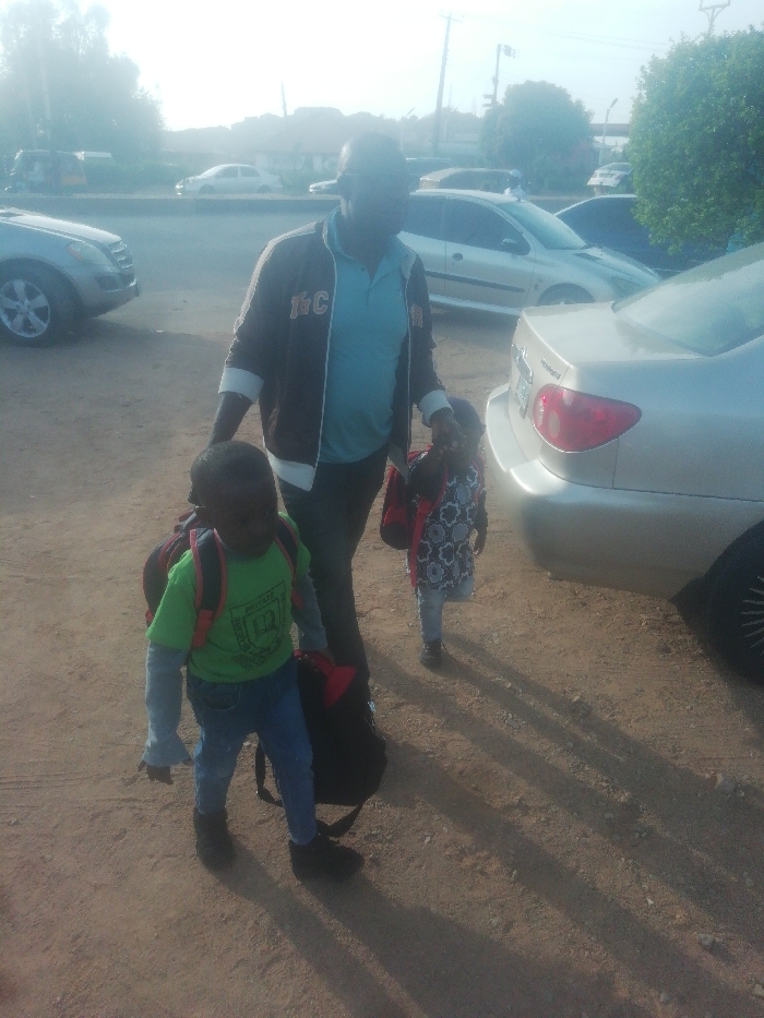 - "A man in a blue shirt and jacket walks with two young children, each carrying backpacks" by FM-7cPvi2, licensed under CC BY 4.0
