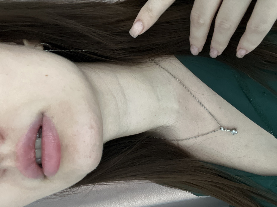 An extreme close-up depicts the lower face, neck, and upper torso of a female individual