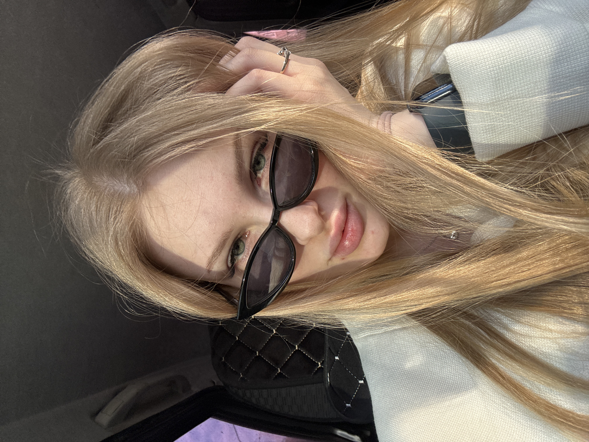 This image presents a close-up, eye-level portrait of a young adult female situated within the interior of a vehicle. The subject has long, straight, golden-blonde hair and light-colored eyes, with a direct gaze toward the camera. She wears black, cat-eye style sunglasses that partially obscure her eyes. Her lips appear full. The subject is dressed in a light-colored, possibly off-white, knitted garment and a delicate silver-toned necklace with a small pendant. Her left hand is raised, with fingers resting against the left side of her face, near her temple, and a silver-toned ring with an abstract design is visible on her left ring finger. A dark smartwatch is worn on her left wrist, partially concealed by her sleeve. The vehicle's interior includes a dark headliner visible at the top left of the frame. Behind the subject, a black car seat is visible, featuring a diamond-quilted pattern with light-colored stitching. Natural sunlight illuminates the subject from the right, casting shadows on the left side of her face and within the vehicle. An out-of-focus, reddish-purple hue is visible through the left side window, suggesting an external environment. No elements within this image provide specific identifying information regarding its location in Perm, Russia.