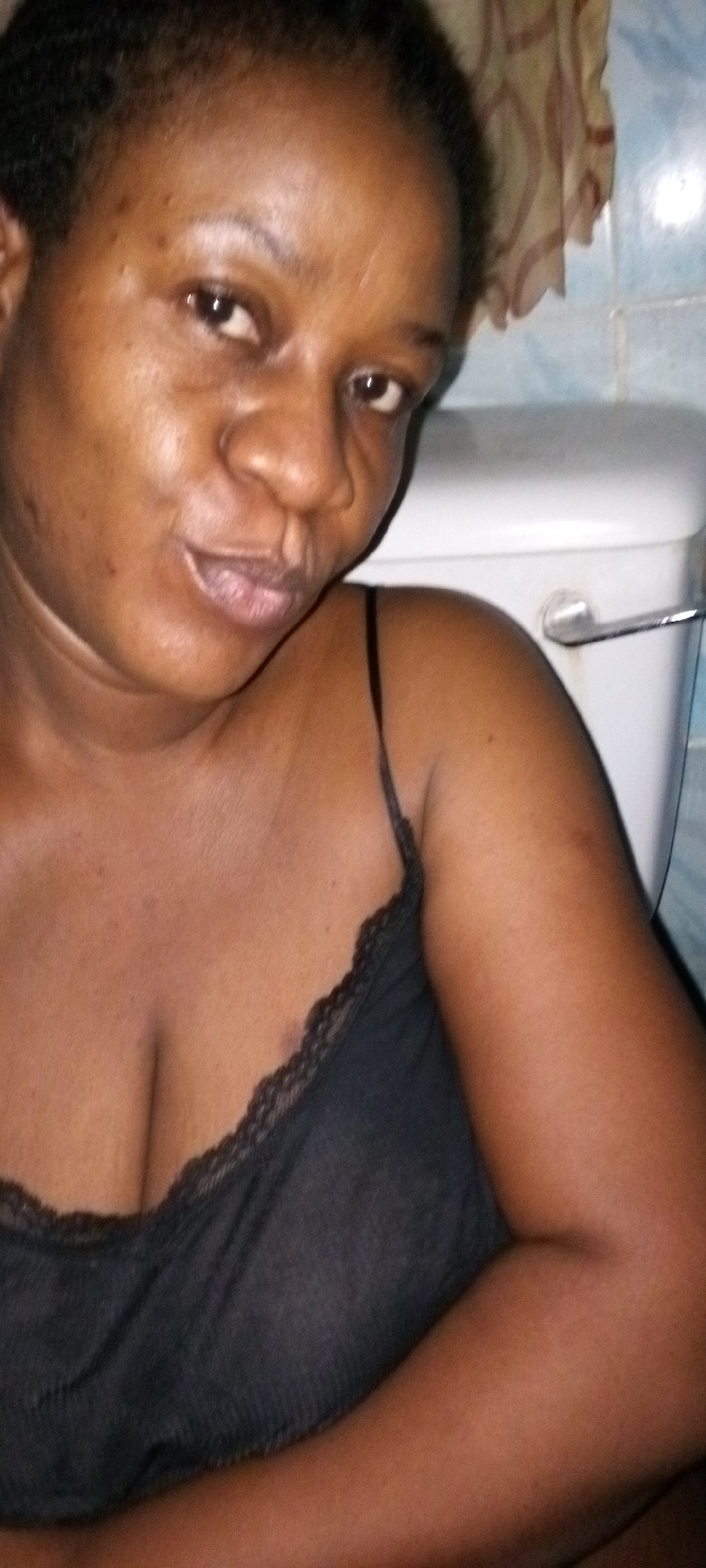 A dark-skinned woman in a black camisole looks at the camera with a slight smirk. The camisole has a lace trim along the top. Her face is smooth with a few blemishes. She has dark eyes and full lips. Behind her is a white toilet and a patterned towel hanging on the wall, indicating she's in a bathroom. Her right arm is visible, resting across her body. The overall image has a casual, selfie-like quality.