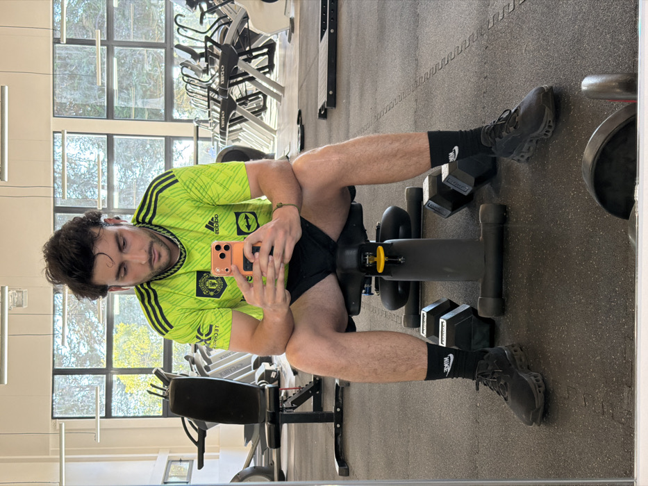 - "A man in a green and yellow shirt with black shorts sits on a leg extension machine, holding a phone up to take a selfie" by FM-wrSCM2, licensed under CC BY 4.0