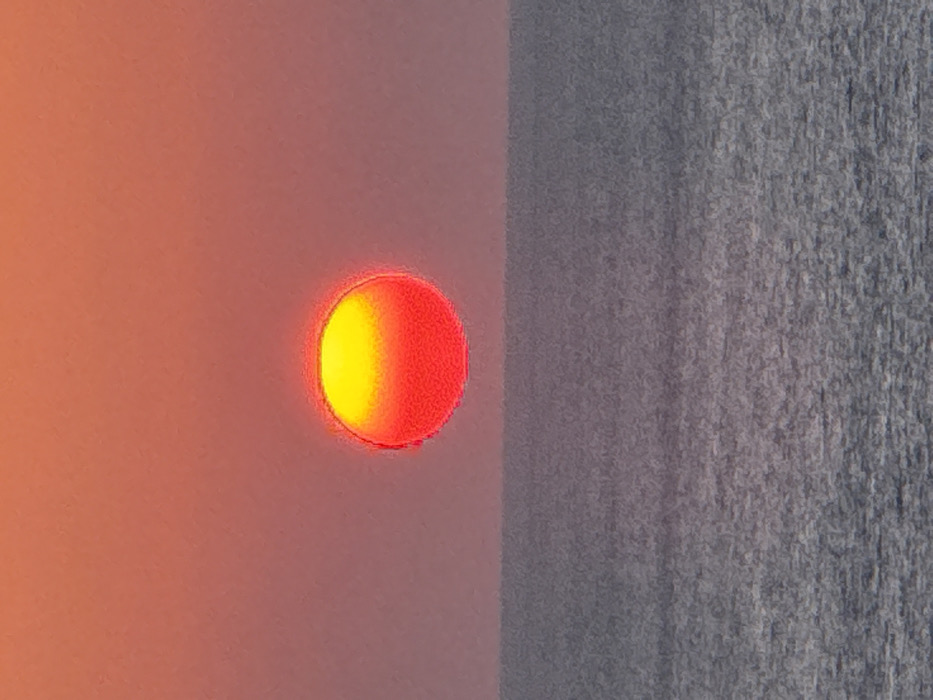 The scene depicts a celestial event, likely a sunrise or sunset, over a body of water in Alonia, Greece. A prominent, circular solar disc is centrally positioned in the upper half of the frame, exhibiting a gradient from vibrant yellow at its top to deep red at its bottom. The sky above the horizon is uniformly colored in shades of orange-red. The lower half of the image presents the surface of the sea, characterized by a textured, subtly rippled appearance in grey-blue tones. No human figures, vessels, or other distinct objects are visible, and no actions or interactions are depicted within the frame.