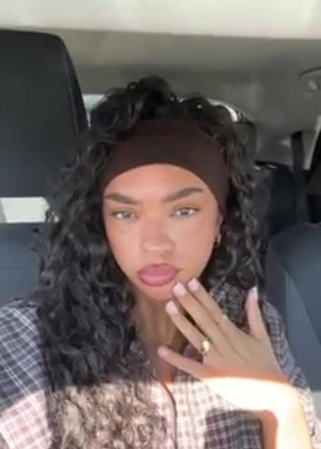 young woman with curly dark hair and a brown headband sitting in a car. She is wearing a brown and white plaid shirt and has several pieces of jewelry on her fingers, wrist, and neck. She purses her lips and places her hand near her mouth. The car's interior is visible, including the seats and dashboard. The scene is well-lit.
