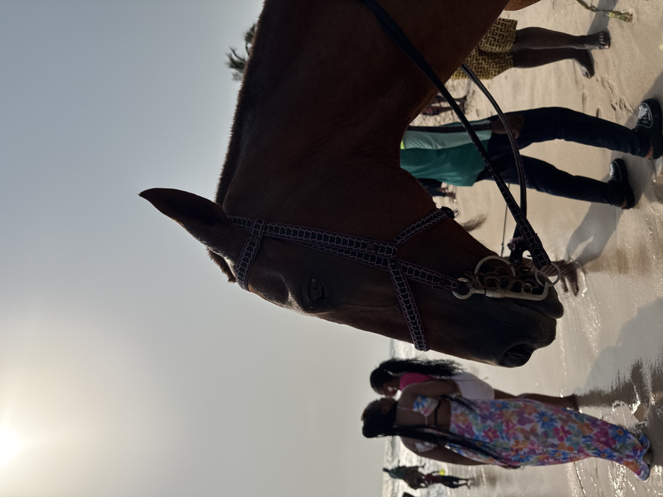 The image depicts a crowded beach scene in Mopo-Akinlade, Nigeria, under a bright, hazy sky. In the immediate foreground, the right profile of a brown horse's head and neck is prominent. The horse wears a black and white patterned bridle with a metal bit. Its left eye is visible. To the left of the horse, in the midground, a woman with long braids stands in shallow water, facing away from the camera. She wears a long, backless floral dress in shades of pink, blue, and yellow. Adjacent to her, a second individual in a pink top and white shorts is partially visible, appearing to interact with the first woman. Further into the background on the left, several indistinct figures are visible on the wet sand and in the ocean, some appearing to be riding horses. Children are also present. Behind the prominent horse, partially obscured, are at least two individuals. One person wears a teal long-sleeved shirt and dark pants, standing on the wet sand, seemingly associated with the horse. Another person wears yellow patterned shorts. The ground consists of wet, light-colored sand at the water's edge. In the far background on the right, palm tree foliage is visible, indicating a coastal environment. The overall impression is of a lively recreational beach setting.
