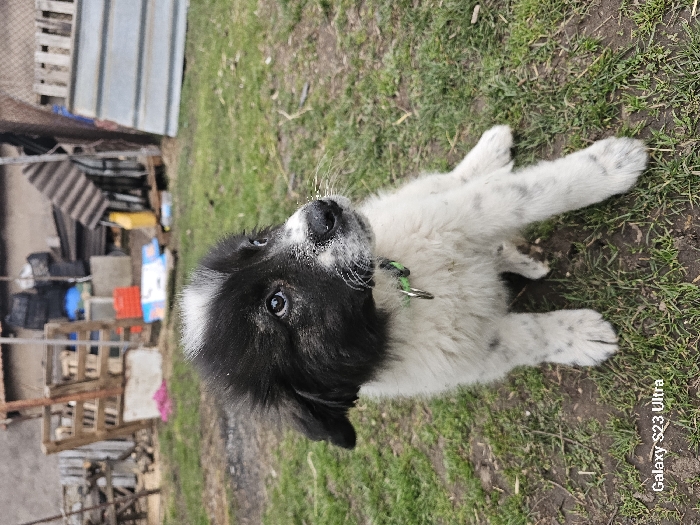 - "A black and white puppy, exhibiting a black head and ears with a white blaze on its forehead and nose, and a white body with dark speckles on its legs, is seated on a patch of grass and bare earth in Dobroslavtsi, Bulgaria" by FM-xETiK2, licensed under CC BY 4.0