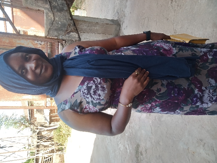 A woman with a blue hijab and floral dress stands outside. She has a gold bracelet and ring on her left hand. A watch is visible on her left wrist. She holds a yellow purse. The background shows a weathered structure with exposed metal and concrete. The ground is light-colored concrete. Some greenery is visible on the left side of the frame.