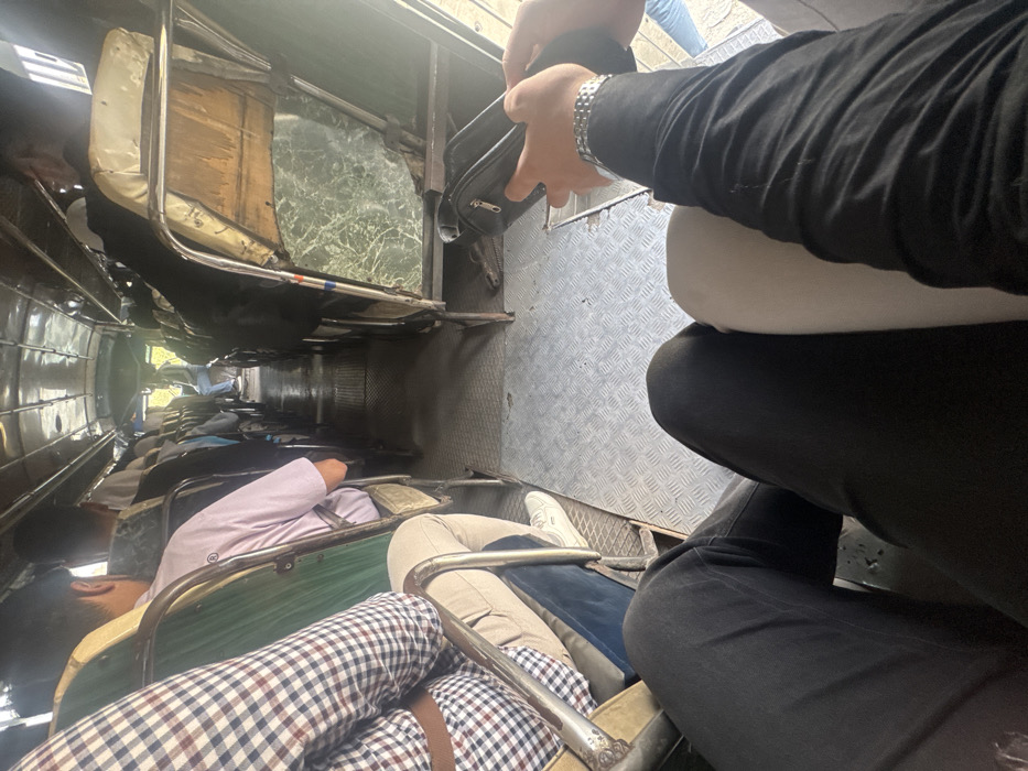 The interior of a crowded bus, filled with passengers sitting in close proximity