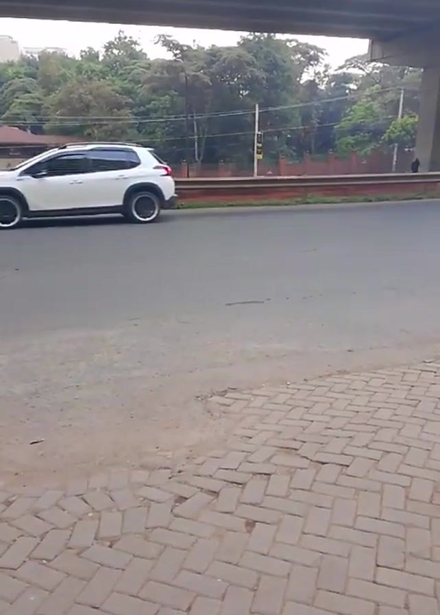 street scene under a bridge or overpass. A white SUV drives past, followed a few seconds later by a silver SUV. The vehicles are traveling on a paved road with a red barrier alongside it. A brick sidewalk runs along the bottom of the frame. Trees and buildings are visible in the background.