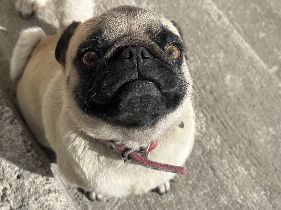 A fawn pug with a black mask and brown eyes sits looking up at the camera. The dog wears a frayed red collar. The pug has a wrinkly face and short fur. The background is a concrete surface with sunlight casting shadows. Part of another dog, possibly white, is visible in the upper left corner.