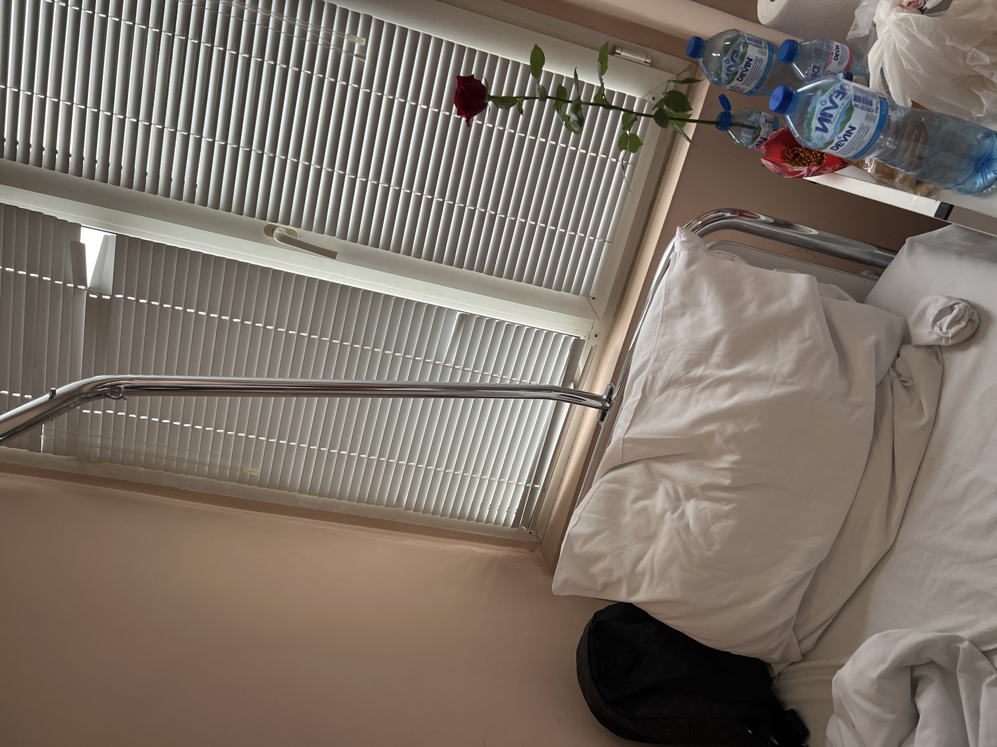The image depicts an interior scene, likely a hospital room in Sofia, Bulgaria, based on the "Devin" water bottle label. The room is characterized by a window with closed blinds, a hospital bed with white linens and a black bag near the pillow, and a side table holding several bottles of "Devin" water and a small snack bag. A single red rose is placed against the window blinds. The environment appears sterile and functional, typical of a healthcare setting. There are no people visible in the frame.