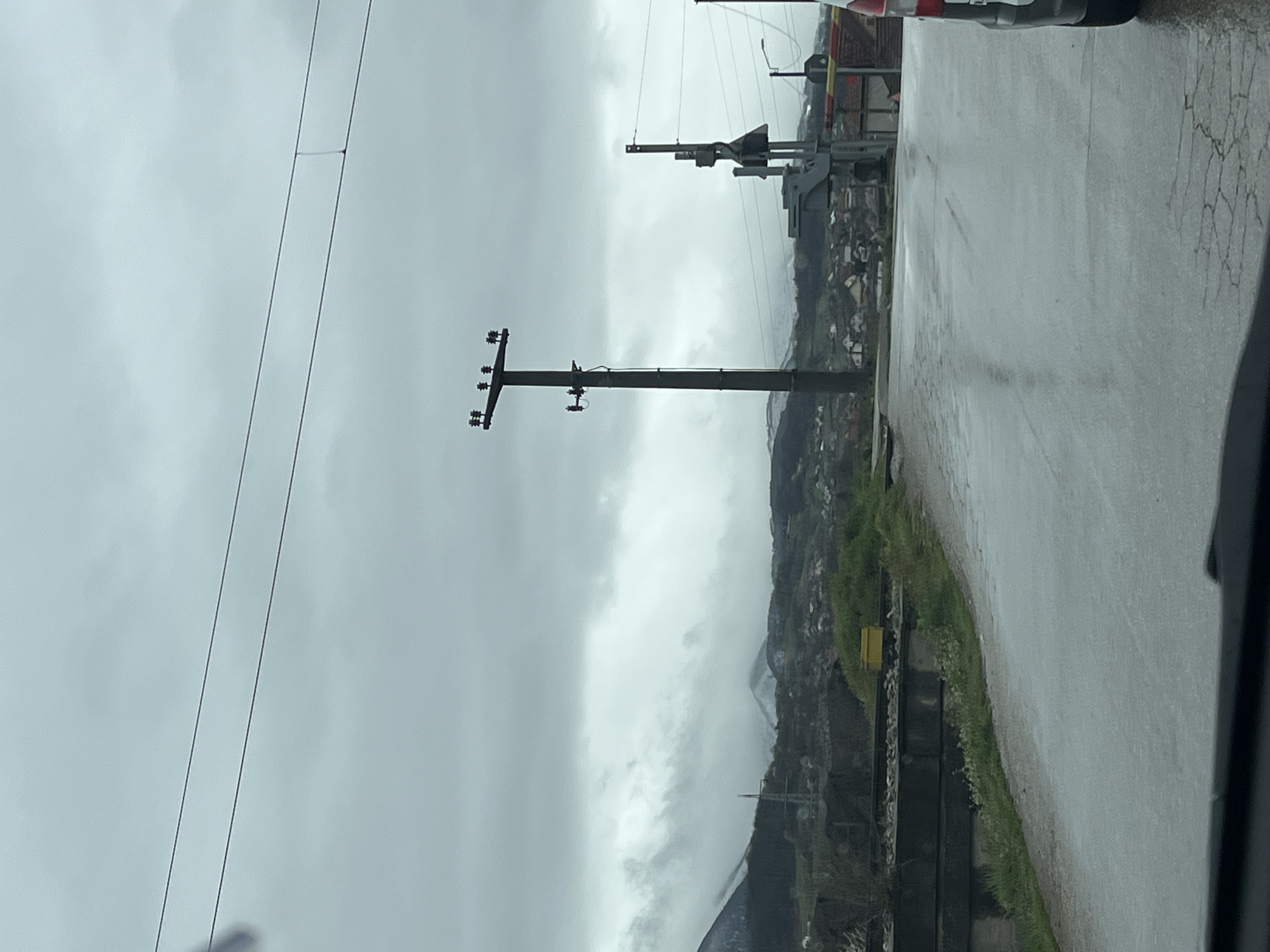 scene in or near Cacak, Serbia, on a cloudy day, seemingly captured from inside a vehicle moving along a wet, cracked road. A utility pole with wires is visible to the left of the road. On the right side of the road, a grassy verge transitions into a hillside populated with buildings and vegetation. In the distance, mountains are visible, obscured by heavy cloud cover. A railway crossing barrier is seen up ahead, and the camera car is likely at a railway crossing in the region.
