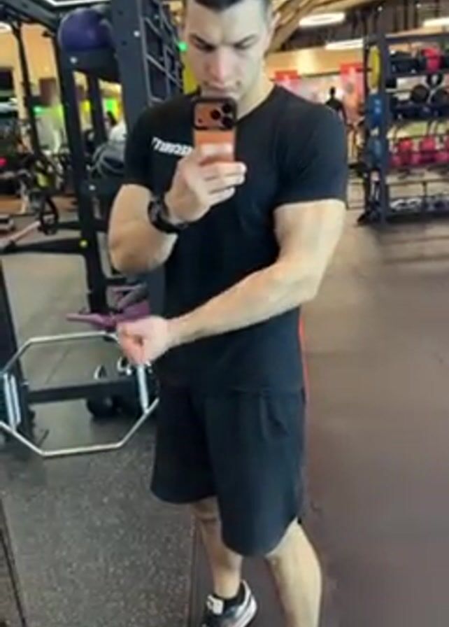A man is standing in front of a mirror in a gym. He is wearing a black t-shirt, black shorts, and sneakers. He is holding a phone in his right hand and using it to take a selfie. The man is flexing his right arm to show his bicep. There is gym equipment visible in the background, including weight machines and free weights. The gym has a modern design with bright lighting. The floor is covered in a dark gray, non-slip surface. Another person is walking in the background.