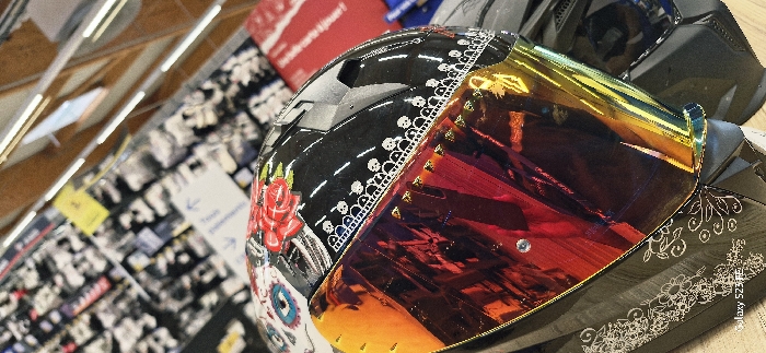 A full-face motorcycle helmet, featuring a custom "Day of the Dead" style design, is depicted in a retail setting in Vendin-le-Vieil, France
