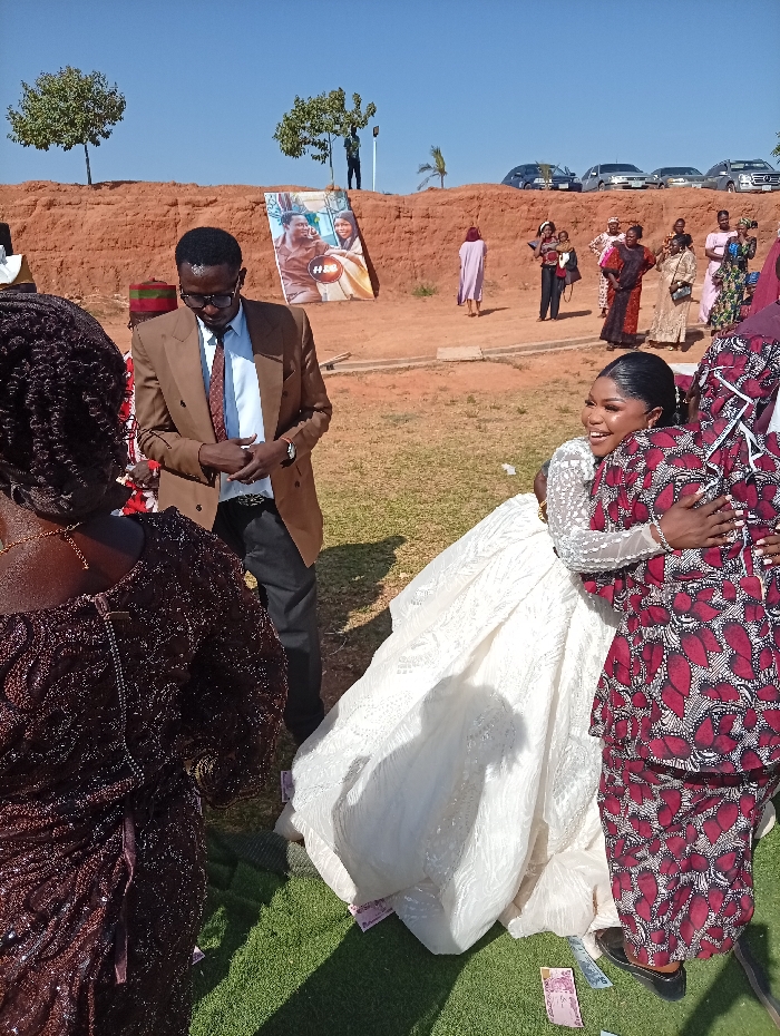 A joyful bride in a white gown embraces a woman in a maroon patterned outfit, surrounded by scattered banknotes. A man in a brown suit stands nearby, observing. In the background, other guests gather, some in traditional attire. A large poster stands near a grassy hill, with parked cars visible in the distance under a clear sky.