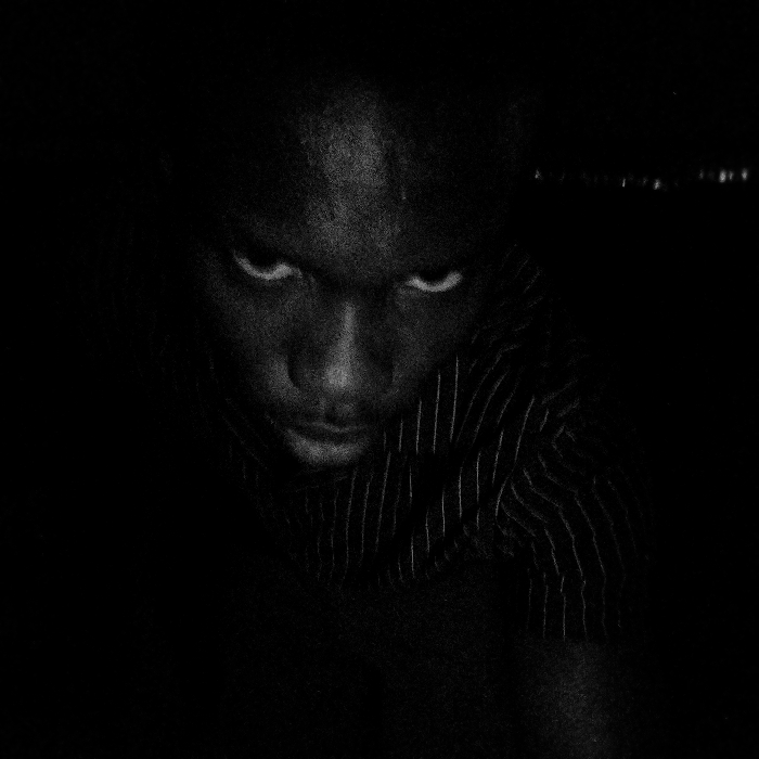 A close-up, low-key black and white image depicts a person with intensely staring eyes in near darkness