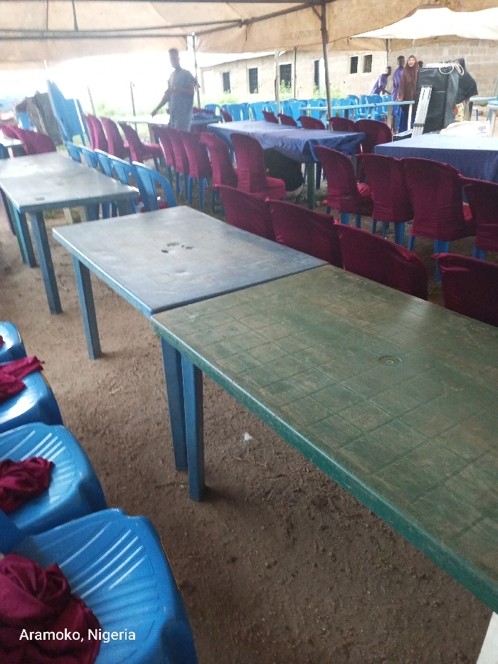 Under a tent, rows of blue and maroon chairs stand ready for an event. The chairs are not occupied, some adorned with maroon fabric. In front of them, tables line up, some covered in blue cloths. A few individuals are visible in the background, adding a sense of anticipation to the scene. The setting, likely for a gathering, is marked by a combination of rustic and festive elements. The image is tagged "Aramoko, Nigeria".