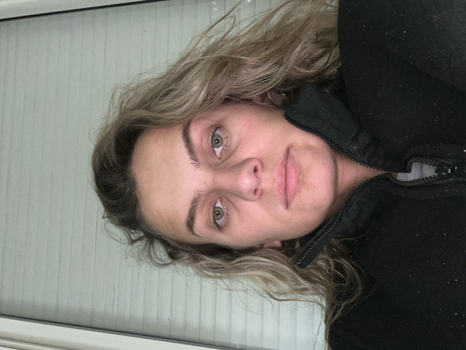 A woman with wavy blonde hair and light green eyes faces the camera. She wears a black zip-up jacket. Her eyebrows are thick and well-defined, and her lips are full. The background appears to be a white vertical blind. The image is slightly tilted.