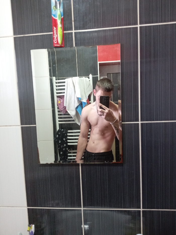 This image depicts an indoor scene within a bathroom located in Vetren Dol, Bulgaria. The walls are predominantly covered in dark grey/black textured tiles, accented with white tiles, and separated by white grout lines. A rectangular mirror with a dark frame is mounted on the wall, reflecting a shirtless male individual. The male has short, dark hair and is wearing dark-colored shorts or sweatpants. He is holding a black smartphone with both hands, obscuring his face as he appears to be taking a self-portrait. He wears a silver-colored chain necklace around his neck, a silver-colored bracelet on his left wrist, and a ring on his left hand. In the reflection, behind the individual, a white wall-mounted towel rail is visible, draped with a light grey towel, a blue towel, and a dark piece of clothing with a white pattern. A purple garment is also discernible on the rail. Directly above the mirror, a red and white Colgate brand toothbrush package, containing a green toothbrush, is affixed to the tiled wall. A red surface, possibly a cabinet or shelf, is visible in the upper right corner of the mirror's reflection. The bottom portion of the image shows more dark tiles, consistent with the wall, suggesting the floor surface.
