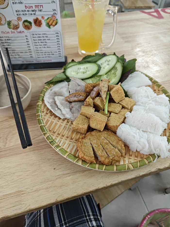 - "A close-up, slightly overhead shot captures a prepared Vietnamese meal on a light wooden table within an eatery identified as "Bún Đậu Bống Đào" in Thủ Đức, Vietnam, based on the partially visible menu" by FM-CuMMb2, licensed under CC BY 4.0