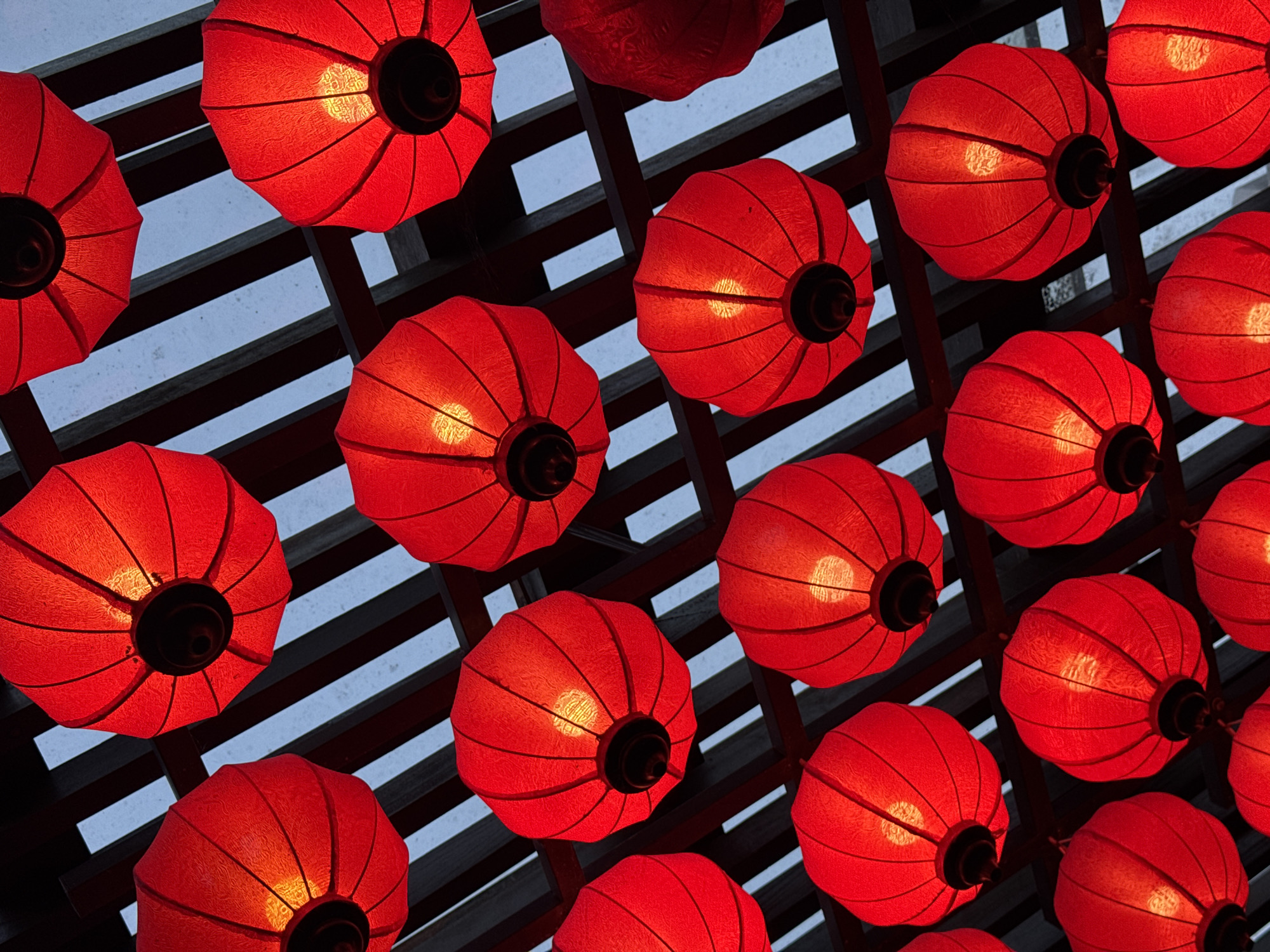 The image presents an overhead view of numerous illuminated red lanterns suspended from a dark wooden trellis structure, commonly found in cultural and tourist areas of Đà Nẵng, Vietnam. Approximately 20 distinct lanterns are visible, filling the frame. Each lantern is spherical or slightly ovoid, constructed from a textured, semi-translucent red fabric or paper, and emits a warm yellow-orange light from an internal source, visible through the material. Dark, circular caps are present at the top and bottom of each lantern. The lanterns are uniformly distributed beneath a grid-like wooden lattice, consisting of intersecting dark brown beams forming rectangular openings. Through these openings, a light blue-grey background, consistent with a sky at dusk or an illuminated ceiling, is discernible. No individuals, specific actions, or interactions are depicted within the scene. The environment is a decorative architectural feature, likely part of an outdoor or semi-enclosed space.