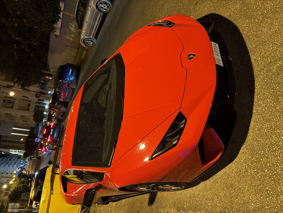 A red Lamborghini dominates the frame, viewed from above. Its sleek hood, accented by the Lamborghini logo, faces right. A visible license plate reads "PD 63914." To the left, a yellow vehicle is partially visible. In the background, a street scene unfolds with various parked cars, buildings, and streetlights, all suggesting a nighttime urban environment.