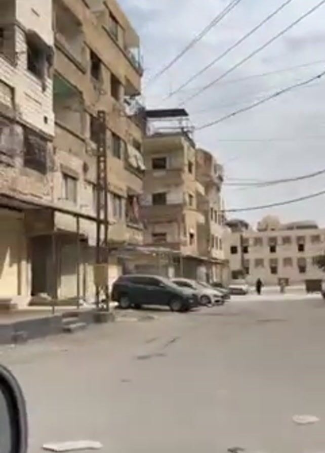car driving through a street in what appears to be a Middle Eastern city. The buildings along the street look old and worn, with some showing signs of damage. There are a few cars parked along the side of the road. Some shops have their metal shutters closed. A sign for a shop called "Stella Store" selling makeup and stationery is visible, as is a restaurant called "Al-Qaysar." The sky is overcast.