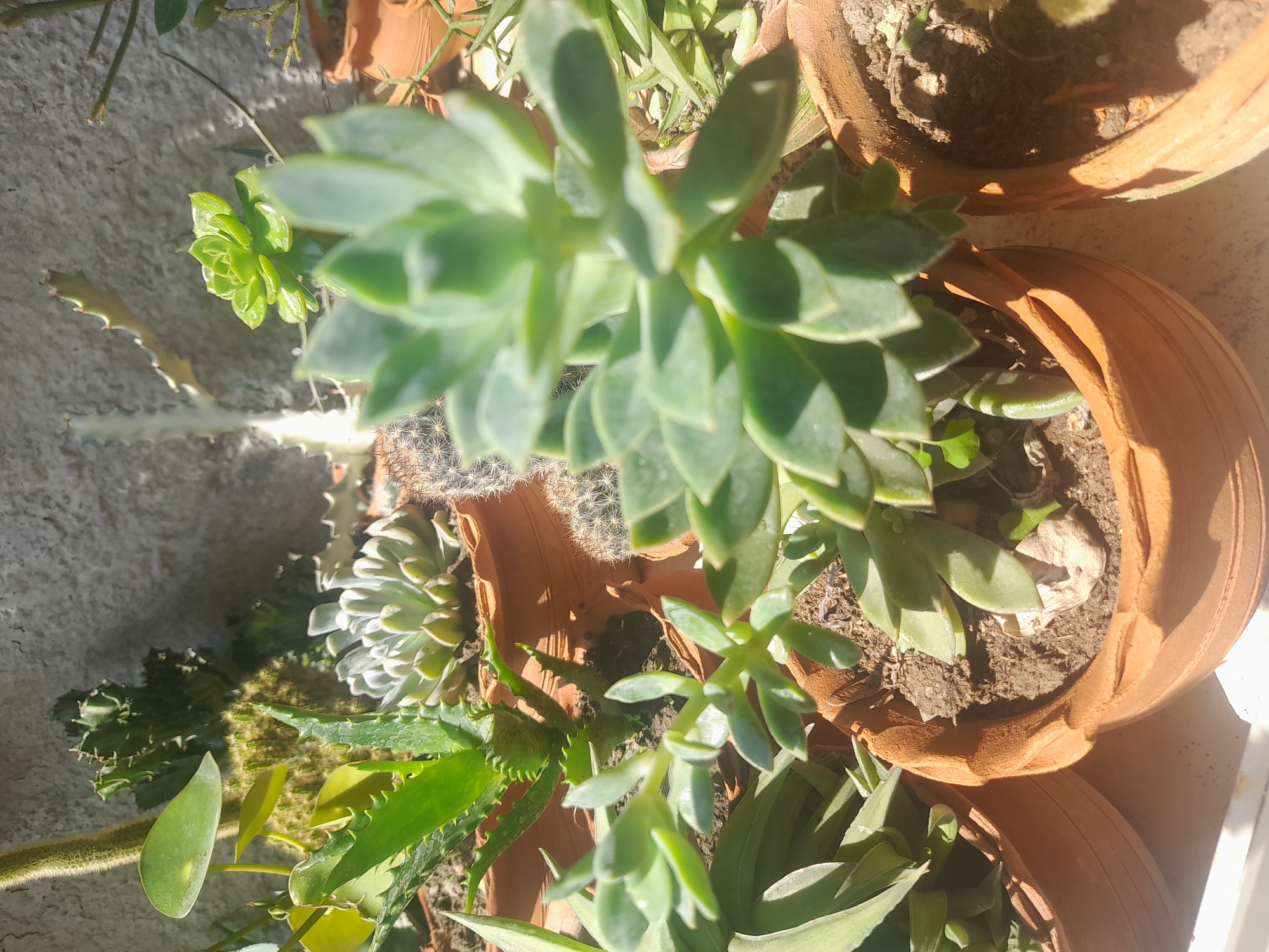 A collection of potted succulent plants is displayed in an elevated, outdoor setting, potentially a balcony or terrace, in Tinaquillo, Venezuela. The plants are arranged in terracotta pots of varying sizes, with several distinct succulent species visible. Among them are Echeveria types with tight rosettes of fleshy leaves, a possible Aloe with serrated leaf margins, a cactus with fine spines, and various other succulents exhibiting different leaf shapes and textures. The pots are filled with soil, and some show signs of previous watering. The scene is lit by natural sunlight, casting shadows that suggest a time of day when the sun is relatively high. A light-colored, possibly concrete, surface forms the backdrop, and the overall impression is one of a carefully cultivated collection of drought-tolerant plants.