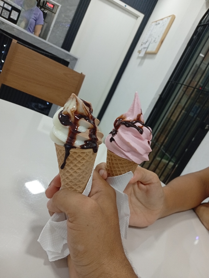 The scene depicts an interior view of a commercial establishment, likely an ice cream parlor, located in Juan Griego, Venezuela. Two individuals are present, evidenced by their hands holding two soft-serve ice cream cones. The left hand, displaying a darker skin tone, holds a waffle cone containing swirled white and light brown ice cream topped with dark chocolate syrup. The right hand, with a lighter skin tone, holds a waffle cone containing pink soft-serve ice cream, also topped with dark chocolate syrup. Both cones are wrapped in white paper napkins and rest on a white, reflective table surface. In the background, a partial view of an employee in a light purple shirt is visible behind a wooden counter, with equipment resembling an ice cream machine or point-of-sale system and a digital display showing red numbers. A dark, vertically ribbed wall is behind the counter area. To the right, a plain white wall features a closed white door and a wooden frame displaying papers. A dark, slatted structure is visible on the far right. The environment is brightly lit.