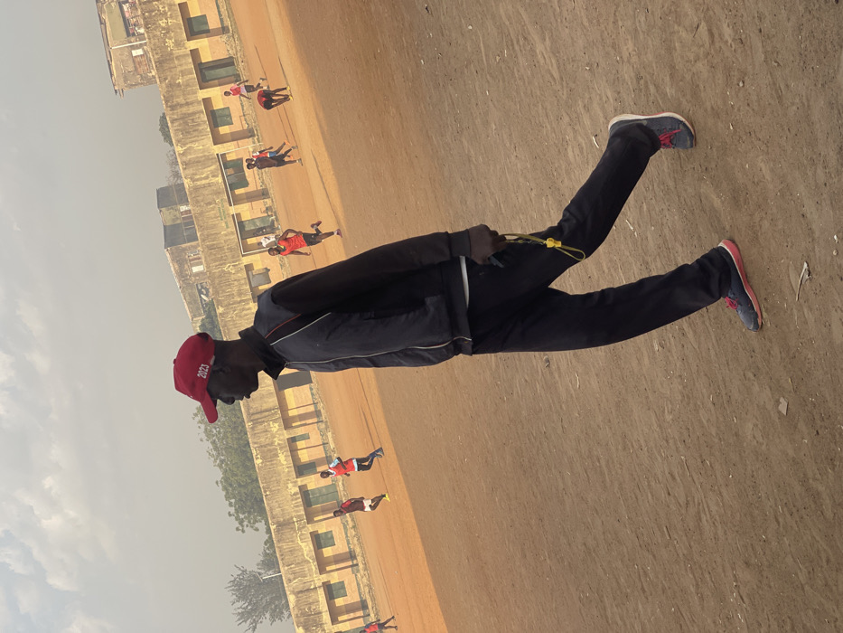 A man wearing a red hat, jacket, and black pants stands on a dirt field holding a yellow item. Several other people in red shirts are visible in the background, appearing to run in a row. A low building with rectangular window openings runs along the side of the field. The sky is overcast.
