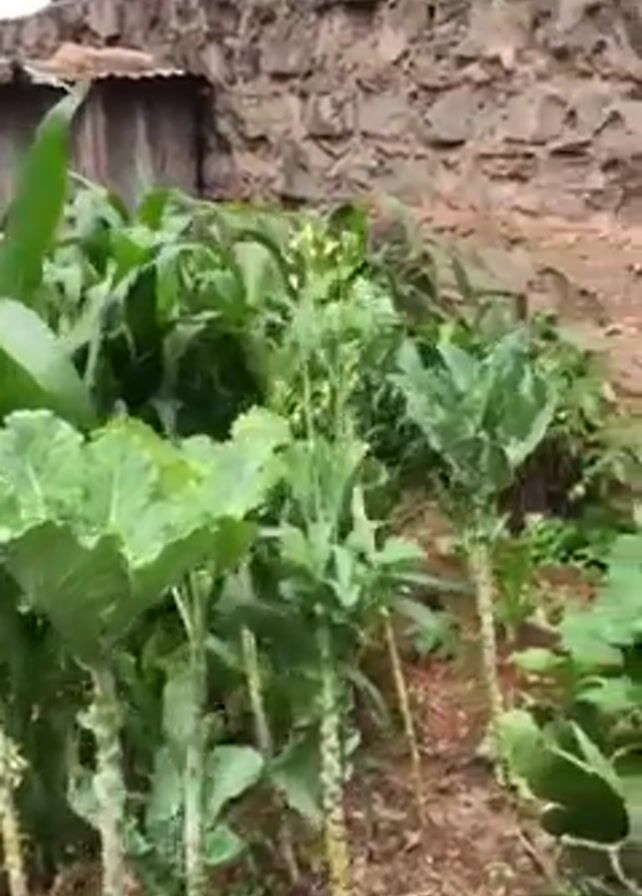 garden with various plants, including corn and what appears to be brussels sprouts. The camera pans around the garden, showing its contents and the surrounding wall made of stone. A rusty, corrugated metal sheet is visible in the foreground, suggesting it might be part of a fence or structure. The garden is enclosed by a wooden fence.