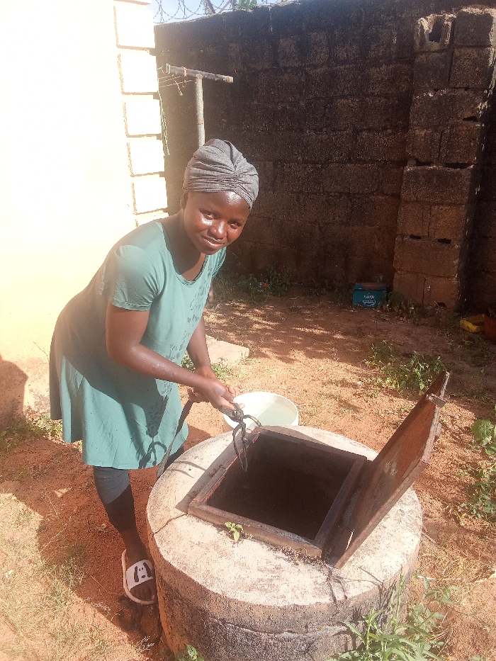 An outdoor scene in Barakin Akawo, Nigeria, depicts a female individual actively drawing water from a well
