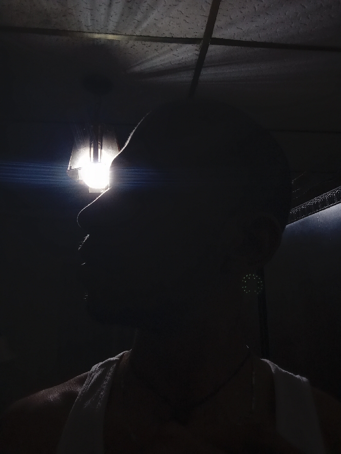 The image depicts a person, silhouetted from the chest up, in profile facing left. The scene is illuminated by a single, bright light fixture positioned to the left and slightly behind the subject's head, causing a significant backlighting effect and lens flare. The person, appearing male, wears a white sleeveless top or tank top, visible on the right shoulder, and a faint necklace. A small, circular, light-colored earring is visible on the right ear. The ceiling above the light source features a textured surface, possibly acoustic tiles, with radial shadows cast by the light. A dark, linear element, likely a ceiling beam, traverses the upper frame. To the far right, a dark, ornate object, potentially a mirror frame or decorative molding, is partially visible. The overall environment is dark and interior. The location is in the city of Guacara, Venezuela.