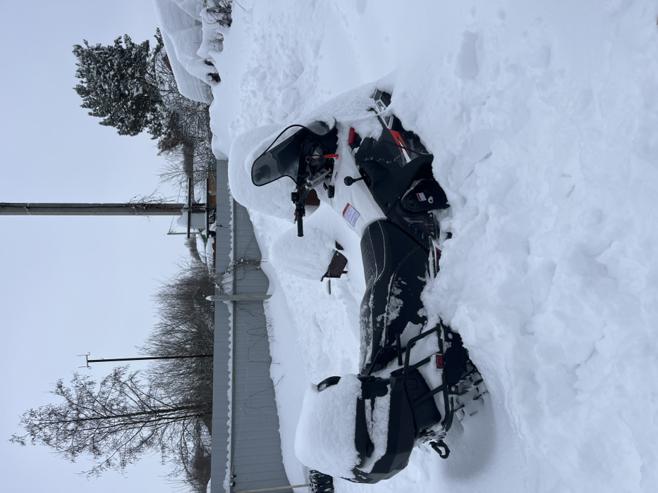 The scene, located in Vasilyevo, Russia, depicts an outdoor, snow-covered environment under an overcast sky. A white and black snowmobile, featuring a dark windshield, handlebars, and a black rear cargo box, is positioned centrally, partially buried in deep, undisturbed white snow. Red accents are visible on the snowmobile's fairing and body panels. The ground is entirely blanketed by heavy snowfall, forming significant drifts around the vehicle and other features. In the background, a silver-grey corrugated metal fence extends horizontally. Behind the fence, bare deciduous trees, dense bushes, and two utility poles are visible; one pole is equipped with what appears to be electrical components. An evergreen tree, also heavily laden with snow, stands towards the right background. A black shovel handle protrudes vertically from the snow near the fence on the far left. No individuals are present, and no active interactions are depicted.