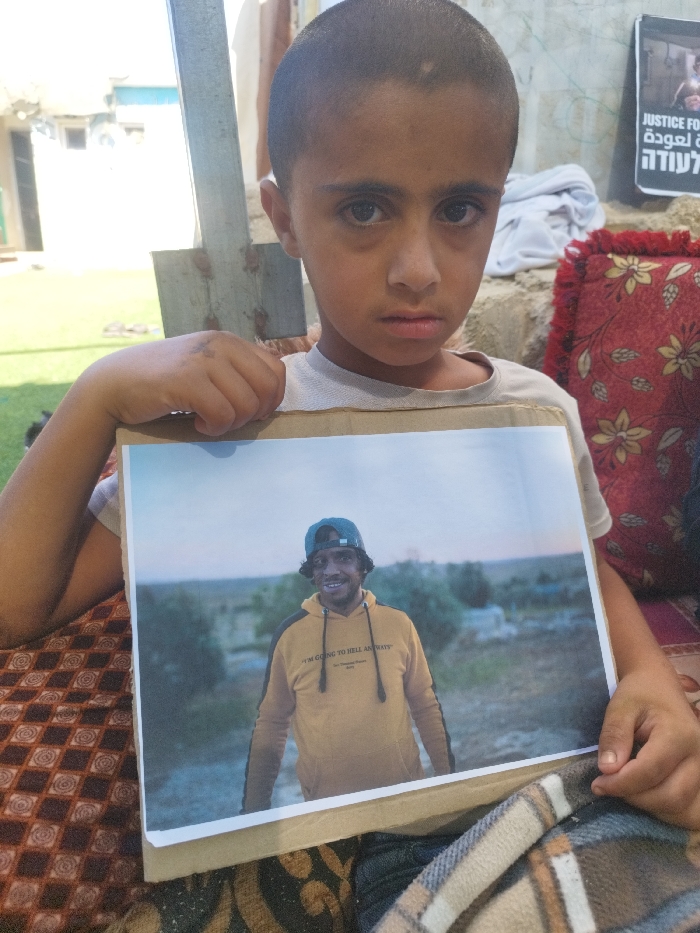 A young boy is depicted seated outdoors in Carmel, Palestinian Territory, holding a framed color photograph. The boy, who appears to be of elementary school age, has short dark hair and dark eyes, and is wearing a light-colored short-sleeved shirt. He looks directly at the viewer with a serious expression. The photograph he holds, approximately A4 size and mounted on a cardboard backing, displays a smiling young man. This man wears a yellow hooded sweatshirt with black accents and the partially visible English text "I'M GOING TO HELL ANYWAYS" printed on the front. He also wears a dark blue baseball cap, reversed, and has dark hair and a beard. The background within the photograph features an open, semi-arid landscape with sparse vegetation and a dirt path under a pale sky, suggesting dusk or dawn. The boy is seated on a patterned reddish-brown mat or rug, covered in part by a plaid blanket with brown, tan, and blue checks. The immediate background to the boy's right (viewer's left) includes a bright, sunlit area, possibly an opening, and a vertical metal beam. Behind the boy, a light-colored block or stone structure is visible, along with draped white fabric. To the boy's right (viewer's right), a decorative red cushion with gold floral patterns rests against the background. Further back, a black poster with white text is affixed to a surface. The poster displays English text reading "JUSTICE FOR" and "THE RETURN," along with prominent Arabic script, including "العودة" (Al-Awda, "The Return"). The scene is illuminated by natural daylight.