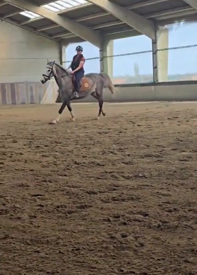 A woman wearing a black riding helmet and vest rides a gray horse in a large, indoor riding arena. The arena has a tan dirt floor and is surrounded by a perimeter fence and walls, with windows providing natural light from outside. The arena's roof is constructed with exposed beams and translucent panels. The horse and rider are moving at a canter, traveling from the center of the arena towards the camera. The camera is low to the ground, capturing the horse's movement and details like its tack and the texture of the arena floor.