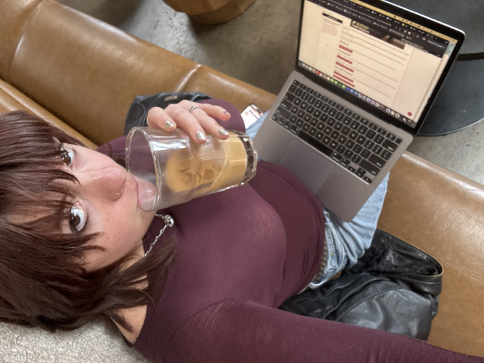 A young woman with dark hair is lying on a brown leather couch. She is drinking from a glass filled with a light brown liquid. She is wearing a long-sleeved maroon shirt and blue jeans. A silver laptop sits on her lap, displaying a web page. A black leather bag is next to her. The photo is taken from an overhead perspective, capturing her face, the drink, the laptop, and the couch.