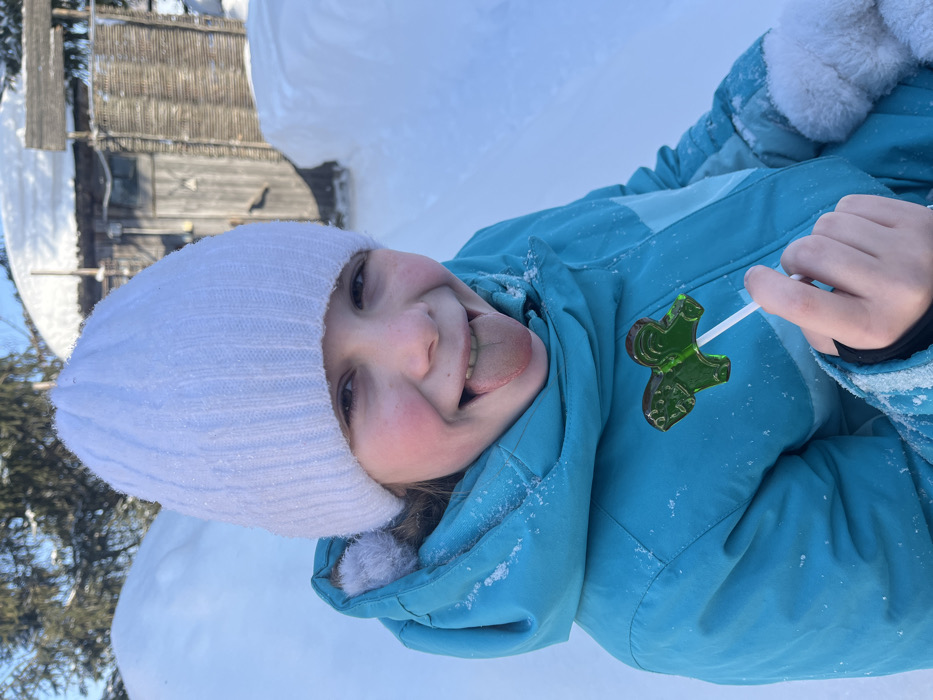 A young child, approximately 6-10 years old, is depicted in an outdoor, snow-covered environment. The child, fair-skinned, wears a white ribbed knit beanie and a bright turquoise winter jacket, with minor snow accumulation on the hat and shoulders. Her cheeks are flushed red. She faces forward, smiling broadly, with her tongue extended, which exhibits a visible greenish discoloration. Her left hand, partially covered by a light-colored cuff or mitten, holds a transparent, dark green, horse-shaped lollipop on a white stick. The background is heavily covered in snow. To the left, a large snowdrift rises. To the right, a rustic wooden structure, possibly an outbuilding or shack, with a snow-covered roof and a wooden door, is partially visible. Adjacent to the wooden structure on its right is a vertical wooden fence or screen. Evergreen trees dusted with snow are visible in the upper left background under a clear blue sky. The scene is located in the city of Ludorvay, Russia.