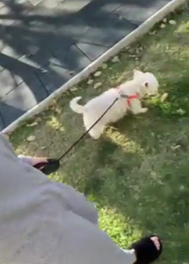 A person wearing light grey sweatpants and black, fuzzy slippers walks a small white dog on a black leash across a grassy area. The dog has a red harness. To the left, there is a playground with black rubber matting. The scene is outdoors, and the sun is shining, casting shadows. There are scattered leaves on the ground.