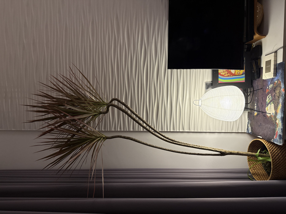 The scene depicts an interior room within Ho Chi Minh City, Vietnam. A tall Dracaena marginata plant with two curving stems and spiky, reddish-green leaves stands in a woven, light brown basket in the lower-left quadrant. To its immediate left, a pleated, dark grey curtain hangs vertically. The background features a textured wall panel with a horizontal wavy relief pattern, illuminated to highlight its contours. In the mid-foreground, a white, spherical paper lantern table lamp, supported by a black wire tripod, rests on a dark, multi-colored surface, likely a desk. The lamp emits a warm, bright light. Partially obscured behind the lamp is a framed piece of vibrant, abstract artwork. To the right, a black flat-screen television or monitor sits on a light wooden stand. On the dark desk surface below the television, several small objects are visible, including a rectangular white box and a dark electronic device. No people are present in the image. The environment is a static, indoor setting with modern decorative elements.