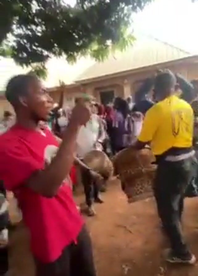 A group of people, primarily young men, are moving and dancing outdoors on a dirt ground. Some are wearing red shirts, others yellow. Some are playing drums. There are buildings in the background and trees overhead. The group appears to be engaged in a festive celebration.
