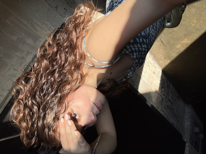 A woman reclines in dappled sunlight. Her curly, shoulder-length hair frames her face. She wears silver hoop earrings and a blue patterned dress. A purse with a chain strap rests on her shoulder. The sun highlights her face as she looks towards the camera, her hand near her cheek. A dark area is visible in the background, contrasting with sunlit walls.