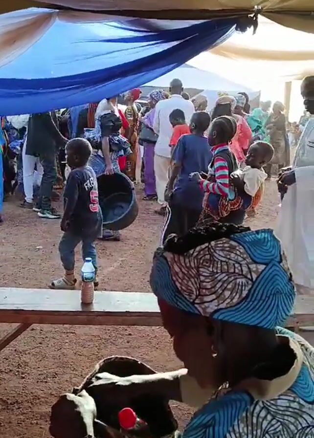 gathering of people under a tent, with a dirt ground visible. Several children are running around, and many adults are standing and talking. A woman wearing a colorful headwrap and a blue patterned shirt is sitting near the camera, seemingly occupied with something in a bag. A table stands in front of her with a bottle of water placed on it. In the background, there's a mix of colorful clothing, suggesting a lively event or celebration. The sunlight filters through the tent covering, creating a bright and open atmosphere. A man dressed in a white outfit is walking by. The scene is filled with activity and people, suggesting a social gathering.