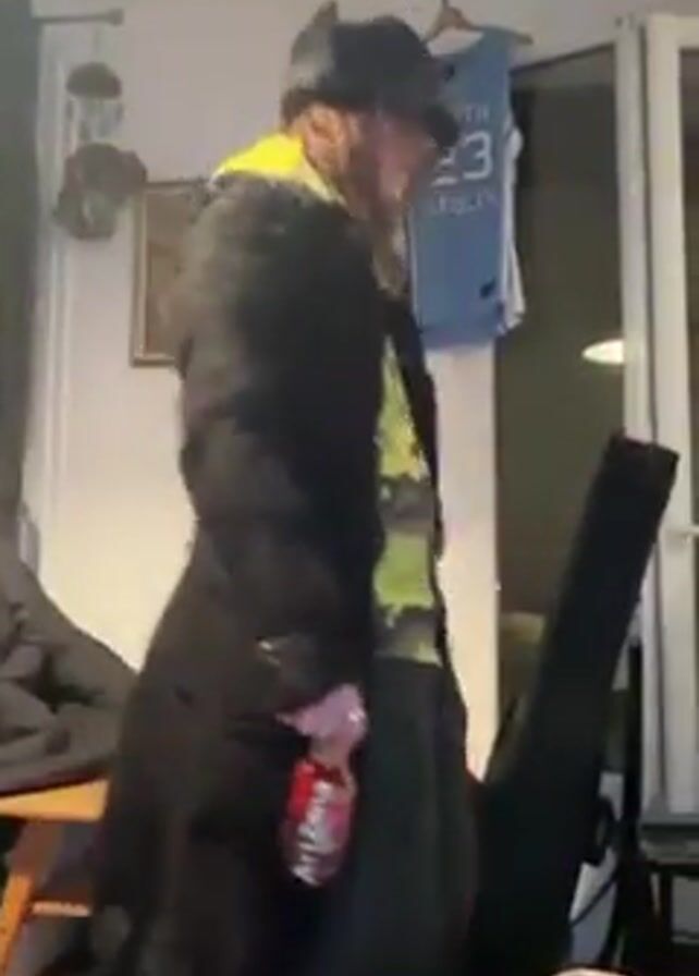 A person wearing a black top hat, black coat, and a bright yellow shirt dances in a room. They are holding a red can or bottle in their right hand. In the background, there is a desk with a laptop, speakers, and other items. A basketball jersey hangs on the wall. The room is cluttered with various objects. The person continues to dance, moving around the room.