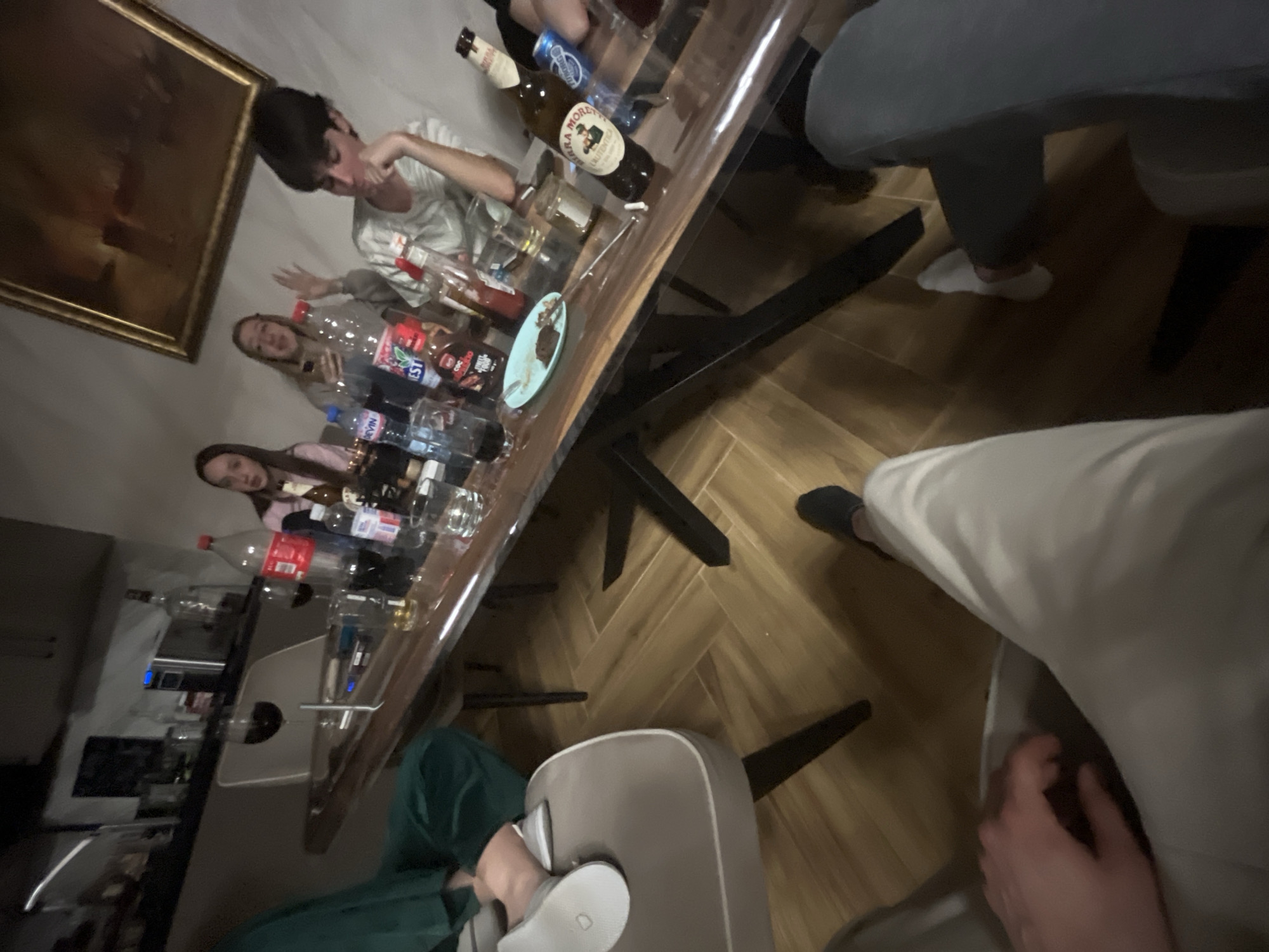 A photograph captures a group of people gathered around a table laden with bottles and glasses. The setting is indoors, presumably a home or similar interior space. A painting hangs on the wall in the background. The table surface reflects the light, and the composition is taken from a high-angle perspective. People are seated around the table, but their full postures are not entirely visible. Given the presence of alcohol bottles and the social gathering, it seems like a casual party or get-together. There is no definitive evidence to ascertain that this image was taken in Ahtopol, Bulgaria.