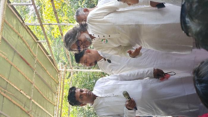 A group of men, all dressed in white kurtas, appear to be engaged in a discussion or presentation outdoors. One man holds a microphone, possibly speaking to an audience, while others listen attentively. The setting features a makeshift structure with bamboo and green sheeting, suggesting a temporary or outdoor venue. The scene seems to capture a public event or a meeting, with focus on communication and engagement.
