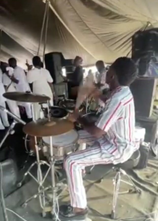 young man playing drums on a stage under a white tent. He’s wearing a vertically striped shirt and matching pants, as well as dark shoes. He has dark hair styled in dreadlocks with a single gold earring in his left ear. The drum kit is chrome with bronze cymbals. Behind him, a group of people dressed in white are dancing. Several speakers and other musical equipment are visible on the stage. The environment appears to be outdoors due to the lighting and the tent overhead. The focus is on the drummer and his performance.