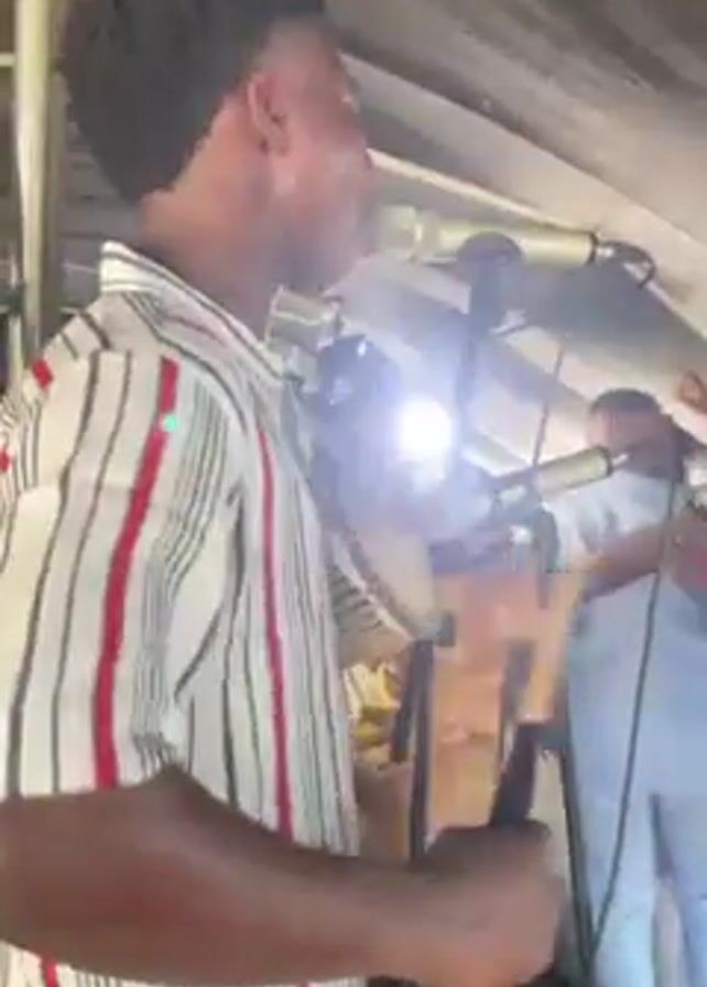 A medium shot from below captures a young black man in a vertically striped white, black, and red shirt singing into a microphone. The video focuses on the man, with his curly hair and concentrated expression, as he gestures with his left hand while performing. Behind him, other musicians are visible, including someone playing a drum. The lighting is bright, with spotlights creating glare. The camera angle is slightly upward, looking towards the performers, and there is some camera movement. The setting appears to be an outdoor performance area, with the roof visible.
