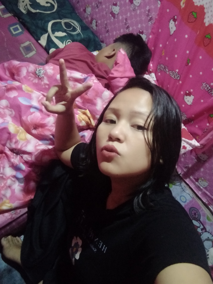 A woman in a black shirt poses for a selfie, making a peace sign. She has dark hair and is lying in bed. Behind her, a child sleeps under a pink floral blanket. The background includes a pillow with a geometric pattern and a pink bedspread decorated with Hello Kitty and strawberry motifs. The lighting is dim, casting shadows on the scene.