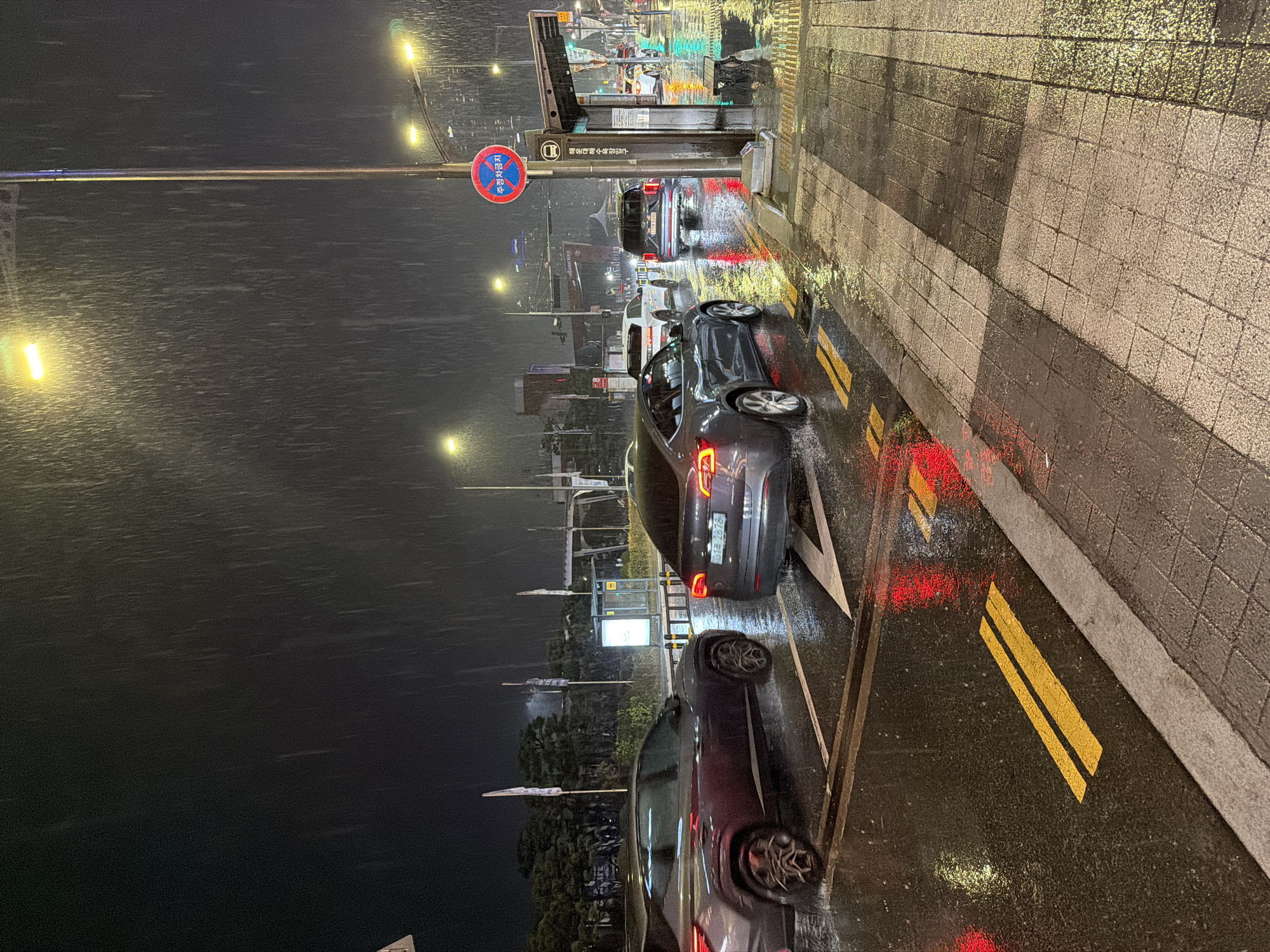 At night in Busan, South Korea, it is raining heavily on a street with cars parked along the side. A bus stop is visible with signage in Korean. Yellow lines mark the parking area. Streetlights illuminate the scene, reflecting off the wet pavement. A no-parking sign is mounted on a pole near the bus stop. The surroundings suggest an urban environment.